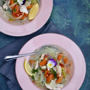 It is a truth universally acknowledged, that a single person in need of some comfort must be in want of a bowl of chicken soup....Or words to that effect. As Jasmine rightly says, chicken soup is widely acknowledged as the remedy for pretty much everything. Chicken soup truly is a salve for the soul. When the weather turns chilly, when you're feeling low, when you need a comforting hug, whatever the weather, chicken soup never disappoints. Growing up, at the first hint of a sniffle my mama would whip up a batch of chicken soup with a hit of extra chilli in there to, you know, clear out the sinuses. Far more delicious than a mug of lemsip. Jasmine's mother is from the Philippines, and by all accounts she makes a mean chicken soup. I love that chicken soup is something that people the world over love, and we all bend and adapt it in our own way. It's a universal dish and one that shows a lot of love and care for the recipient I always think. The Filipino version of chicken soup is called Tinola and is essentially a chicken soup fired up with lashings of ginger, which sounds absolutely delicious. Chicken and ginger is a beautiful combination and the deep fiery, earthiness of the ginger brings another level to the soup which I really like. I think everyone has their own version of a chicken soup. Some are lovingly passed down through families, some are created from scratch and some are pulled from cookery books. But just in case you don't have you own yet or are in search of a new one, here is my beloved chicken soup recipe which never fails to make me feel better. It's nursed me and my loved ones back to health on many occasion and I pass it to you like a recipe baton, hoping it brings you as much joy as it's brought to me. If you've never made you own chicken soup or never made your own stock, well all I can say is that you are in for a treat. The light, subtle broth brimming with goodness is a delight and so easy to make. I highly recommend getting into the habit of whipping up a stock whenever you roast a chicken as it's a magical elixir that's going to transform your cooking. Turn the stock into chicken soup or serve as a broth poured over rice. Or if you are really looking for something to change your cooking game, cook your pasta in the stock..you're welcome.