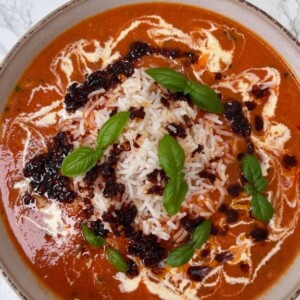 I love roasted tomato and garlic soup so much, so comforting and delicious. This is one of my favourites and I love serving it over rice to give it some texture and a little more substance but hot buttery hunks of bread work equally well.