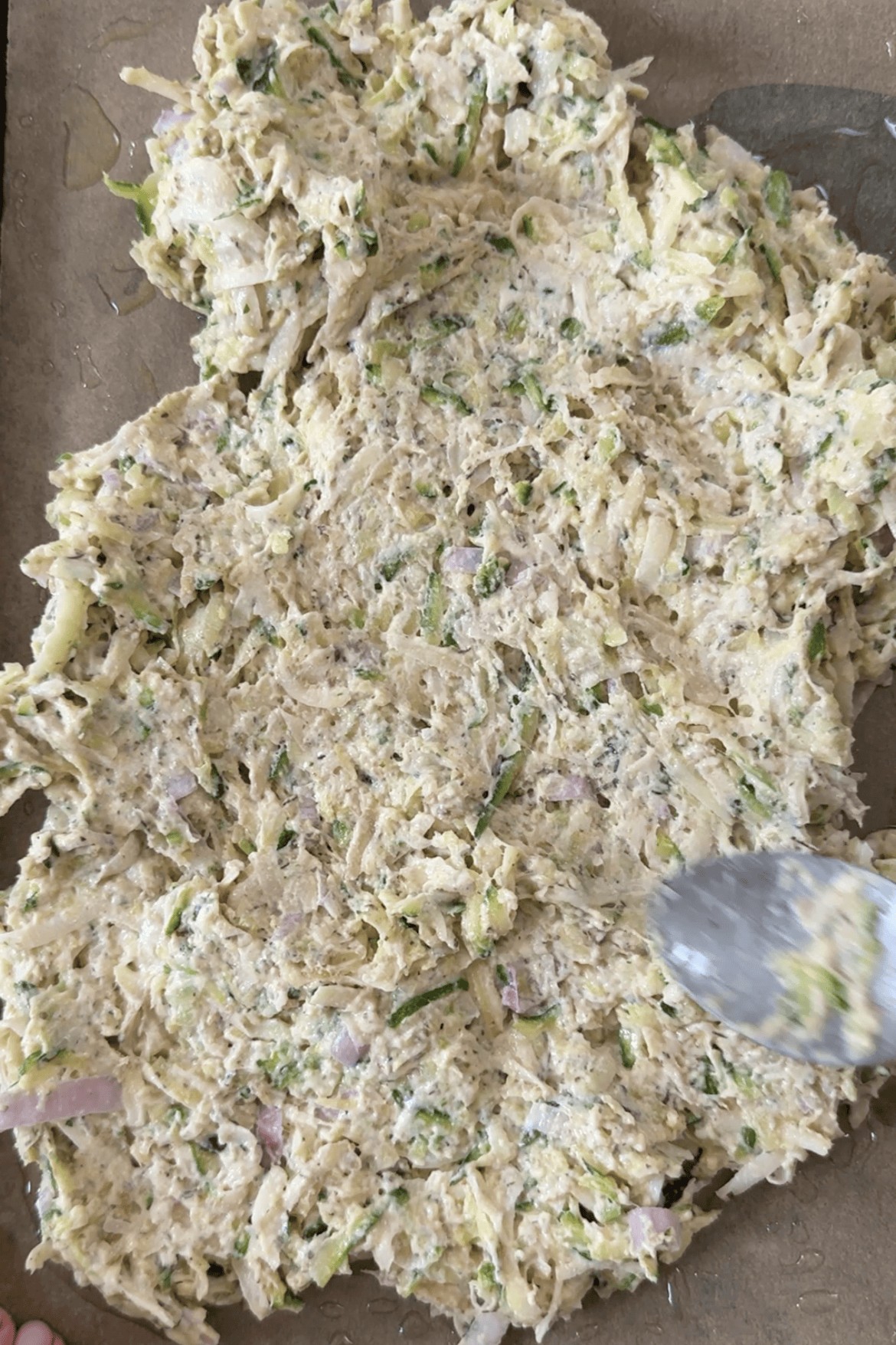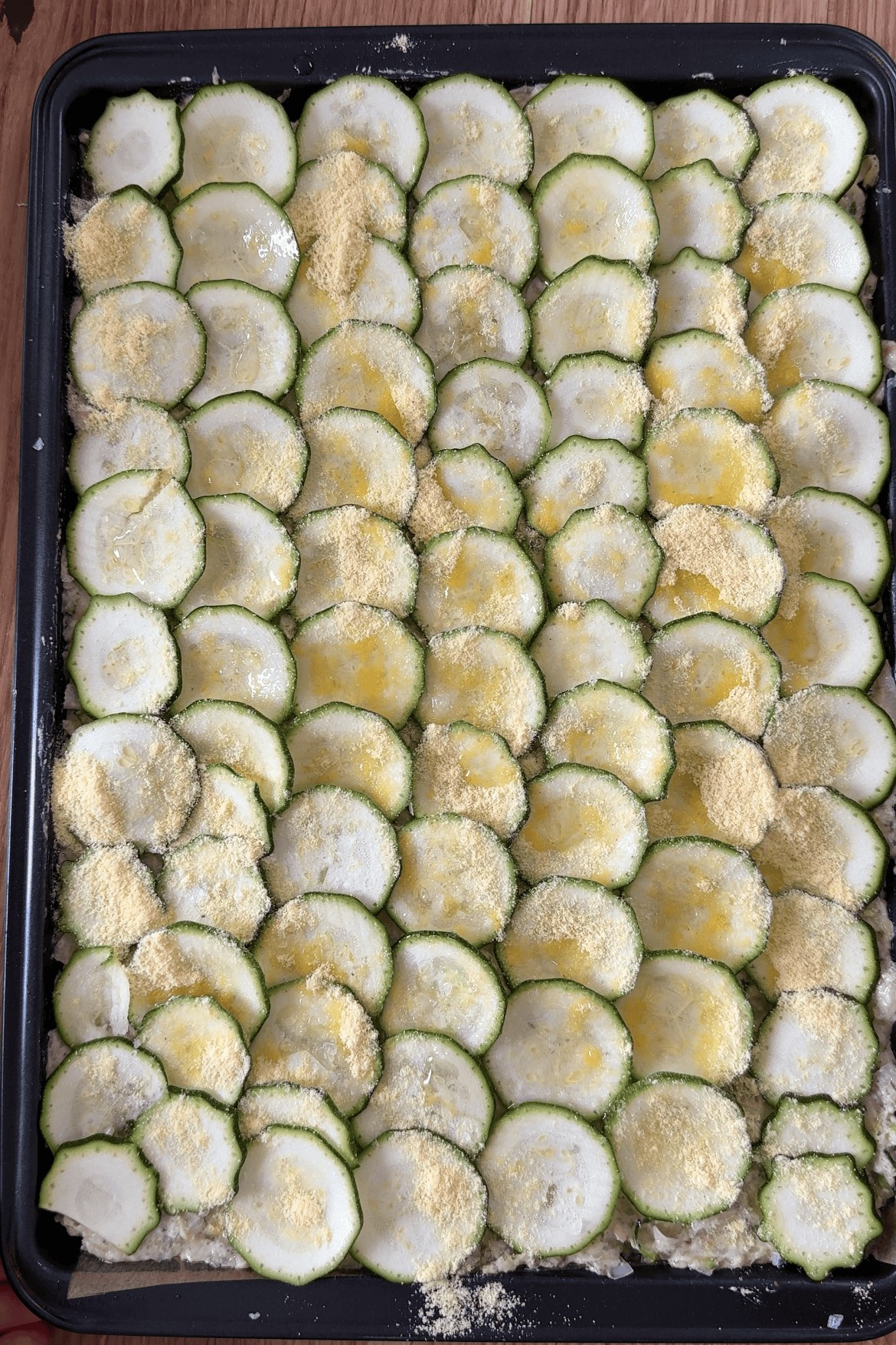 - Pour the batter onto the prepared baking sheet and spread as thinly as you can. Arrange the thinly sliced courgette on top and sprinkle with a little cornmeal. Drizzle with olive oil and season with flaky salt.