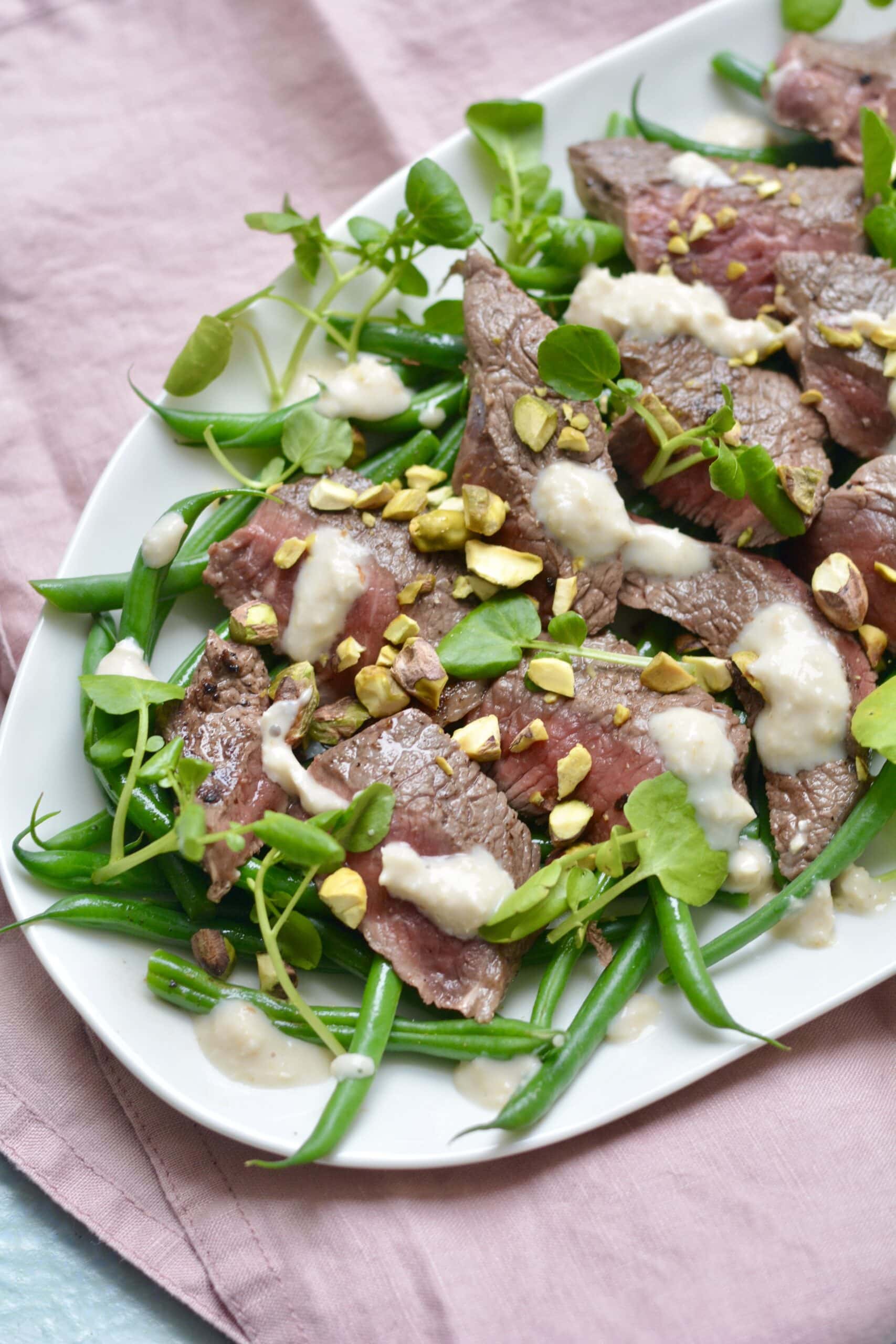 • Scatter the beans on the plate, and top with the sliced steak. Add a scattering of chopped pistachios and a drizzle of horseradish and finish with a scattering of watercress leaves.