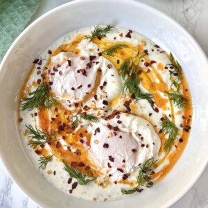Turkish eggs, also known as “Çılbır,” are a delicious breakfast or brunch dish made with poached eggs served over a bed of yoghurt and drizzled with spiced butter.