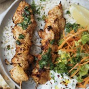 Once the skewers are cooked, Divide between 2 plates. Serve with warm flatbread, fluffy rice and the crisp salad. Spoon over the herb drizzle and add a dollop of the cooling cucumber raita.