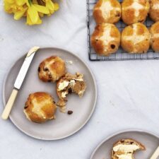 When the buns come out of the oven brush them immediately with the mixture of sugar and boiling water to make them sweet and shiny. I like mine split in half and toasted, served with lashings of butter.