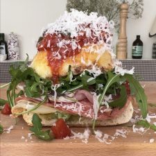 Then assemble the sandwich. Slice and toast your bread. Spread on the pesto and top with a few slices of cheese, salami and prosciutto. Add rocket, top with fried crispy mozzarella, spoon on the tomato sauce and grate fresh parm over the top. Close with the other half of the bread and press down. Slice and enjoy!