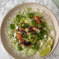 While the rice is cooking you can make the dressing. Simply blitz it all together in a food processor until smooth. Taste and adjust the seasoning to your liking. If it needs a squeeze more lime or a little more salt, don't be afraid to add it.