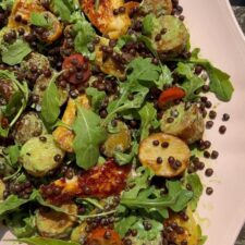 This is such a good salad: hearty but healthy and delicious. Hot honey halloumi with crispy roasted new potatoes, lentils, tomatoes and rocket all drizzled in a creamy basil dressing. Heaven!