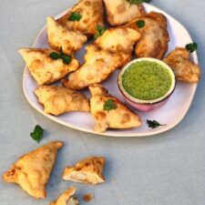 Heat a deep sided saucpean with oil and once very hot, fry the samosa in small batches being careful not to overcrowd the pan. Fry until gorgeous and golden. Remove with a slotted spoon and blot on some kitchen paper before serving with the coriander and mint dipping sauce.