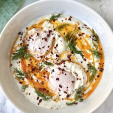 Poaching eggs: Firstly, I always add a splash of white wine vinegar or cider vinegar to the water along with salt. Once it’s simmering, turn down the heat as you don’t want any bubbles coming to the surface aggressively as this breaks apart the white. I like to create a vortex in the pan for poached eggs. Use a spoon to stir the water around the pan in a consistent circle. Then remove the spoon and gently lower the egg in. I often will crack the egg into a ramekin or mug so I can gently tip it into the water rather than it splashing into the pan from the eggshell. Then cook for 3.5-4 minutes depending on the size of the egg. You can test how done it is by lifting the egg out with a slotted spoon and gently pressing it with your finger.